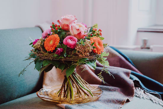 Ihr Blumengruss wird kurz vor der Übergabe frisch und mit viel Sorgfalt von Hand in einem Partnergeschäft in der Nähe des Lieferortes gefertigt – somit ist höchste Qualität gewährleistet.
